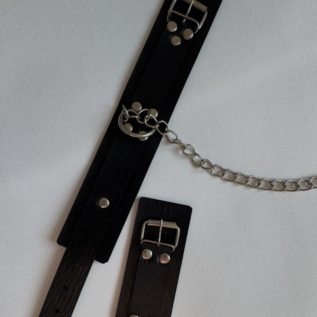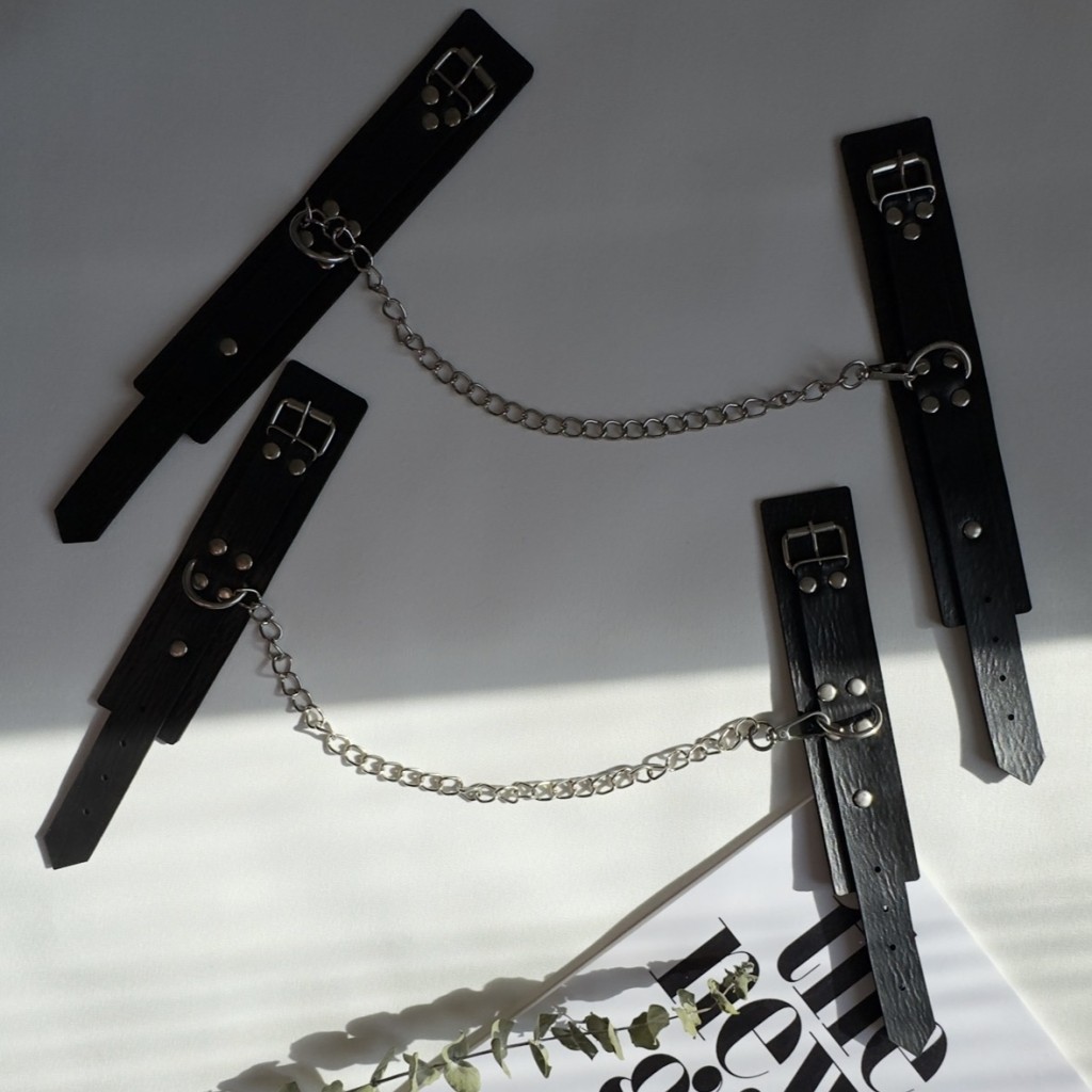 شامل یک جفت گارتر دست که با زنجیر بهم وصل شده و یکجفت گارتر پا که با زنجیر بهم وصل شد